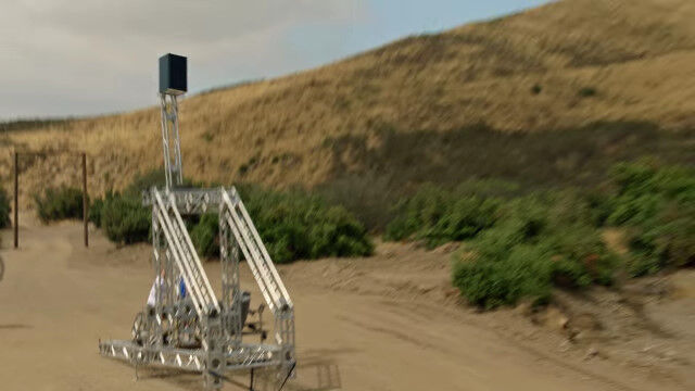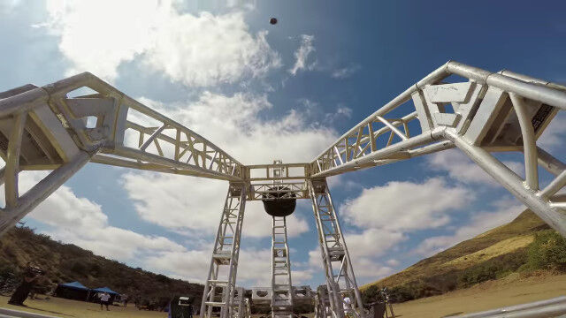 現代の素材で巨大カタパルトを製作。冷蔵庫やボウリングの玉をふっとばして遊んだスローモーション映像