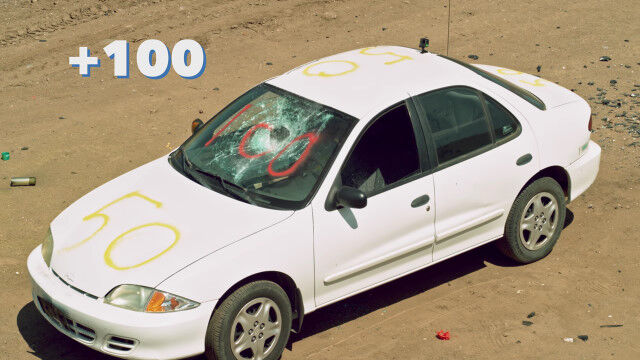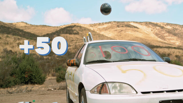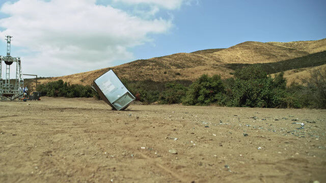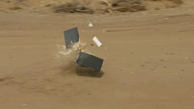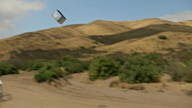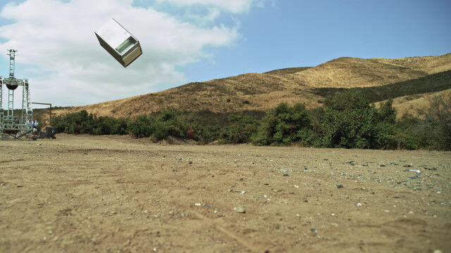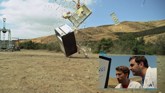 中身の入った冷蔵庫やボウリングの玉、鉄床などをふっとばし、ハイスピードカメラで撮影したスローモーション映像。