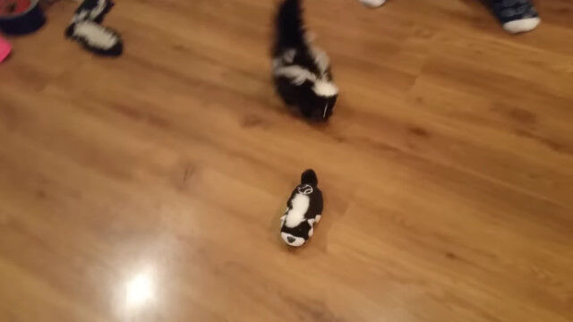 自動的にウロウロ移動する小さなスカンクのオモチャを追いかける、小さなスカンクの赤ちゃん。