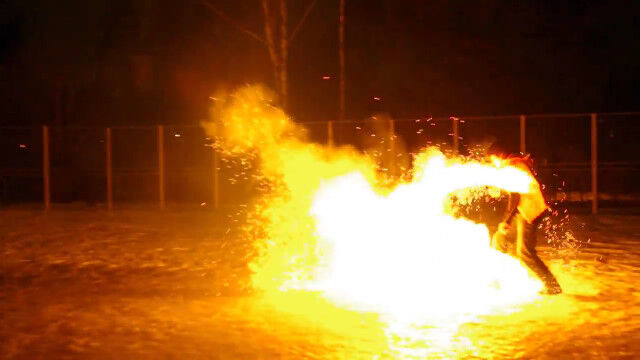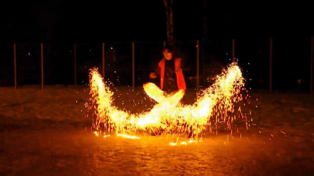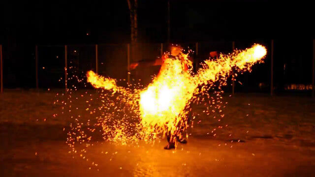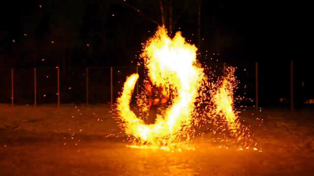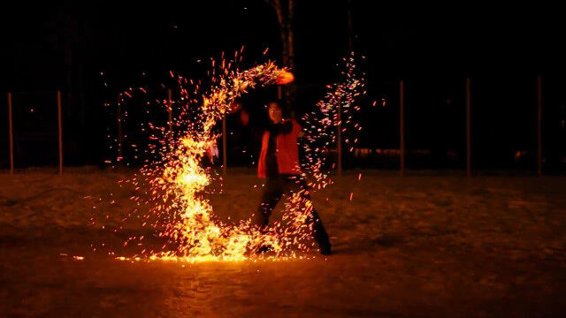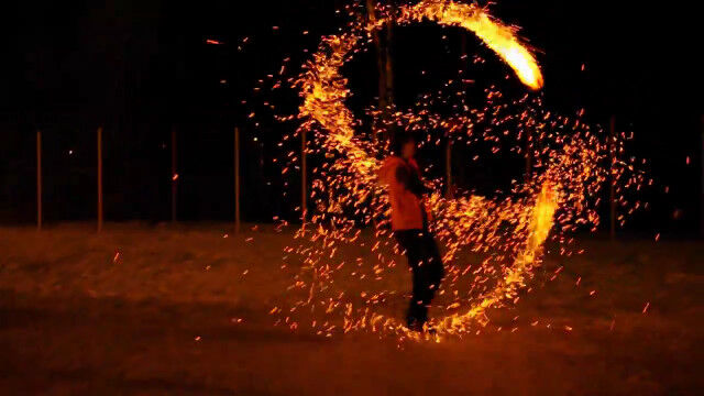 ドミトリー・チモフェーエフさんが披露する、2つの火球を振り回すファイヤーダンス。