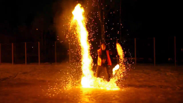 科学の力で炎を操る能力者に!両腕に火炎放射器を装着してのカンフー演武が格好いい