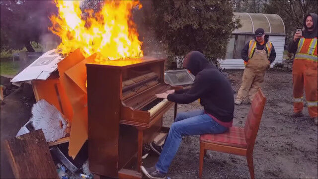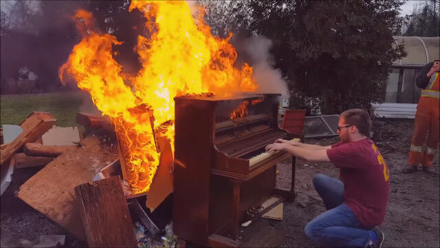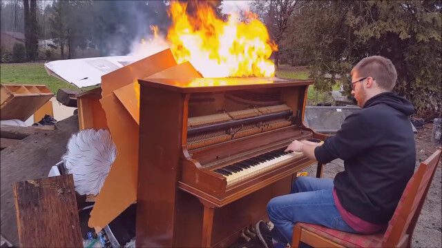 ピアノに背後から火を放ち、徐々に燃え上がっていく様子を眺めつつピアノ演奏。