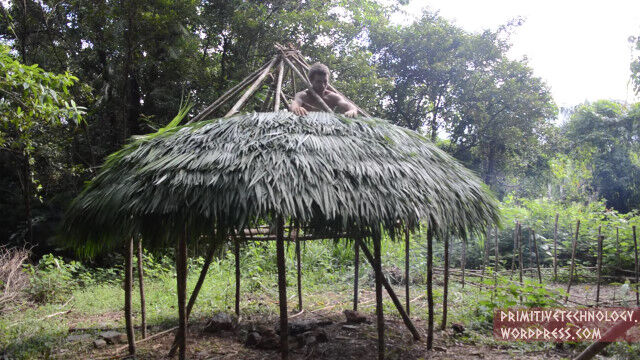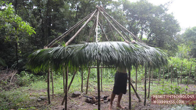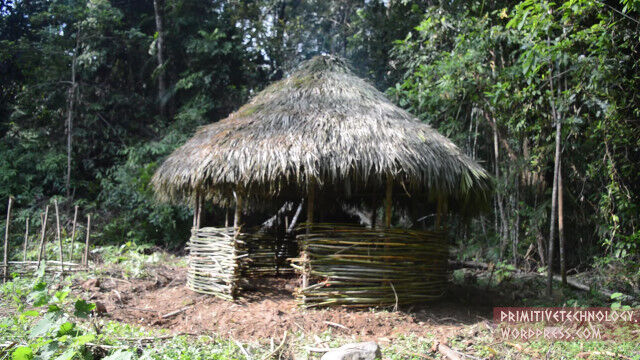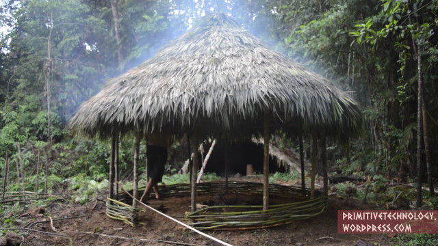 趣味として原始生活を営み、工具や土器、窯に瓦屋根の家まで作り上げてしまうお兄さんが、自然の中の素材だけで作り上げた円形の小屋。