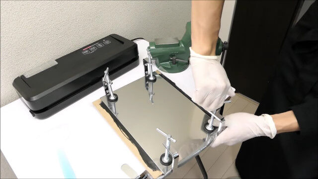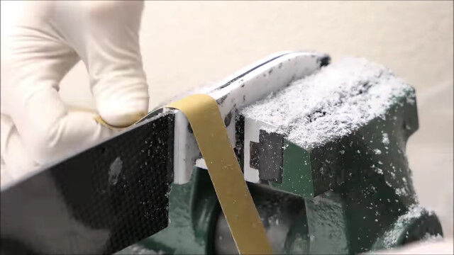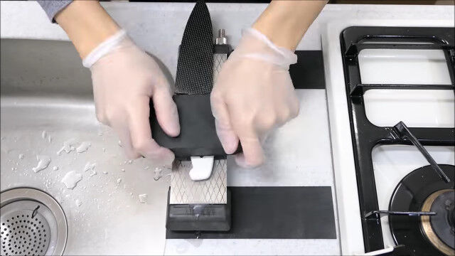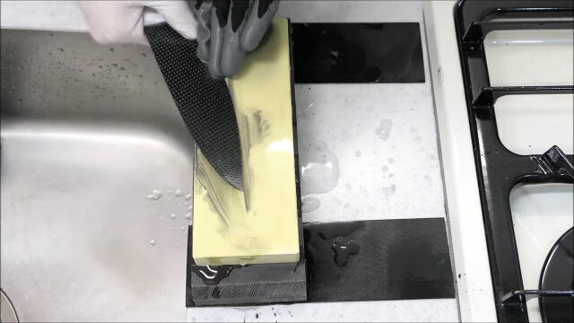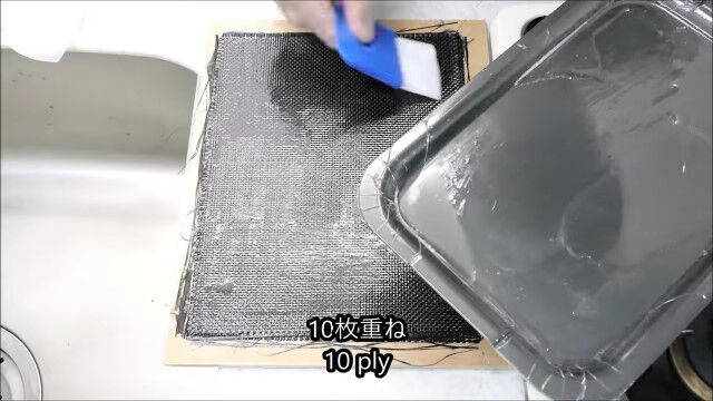 軽くて強い素材、カーボンファイバーのシートを10枚重ねにして固め、砥石を使って研ぎに研ぎまくって包丁にしてしまう映像がすごい。