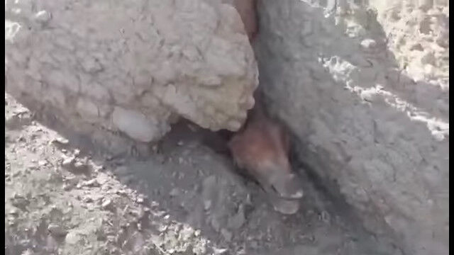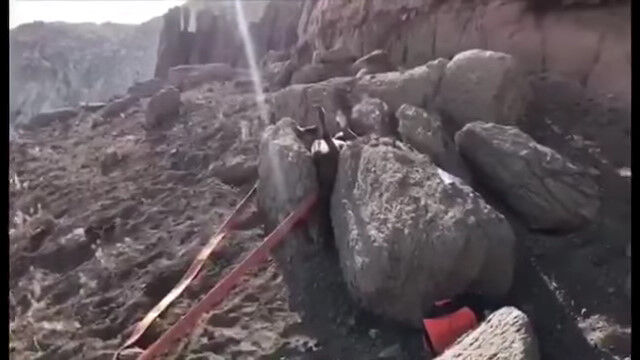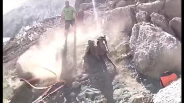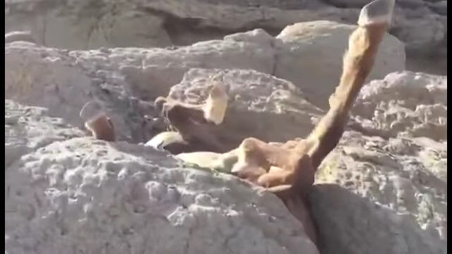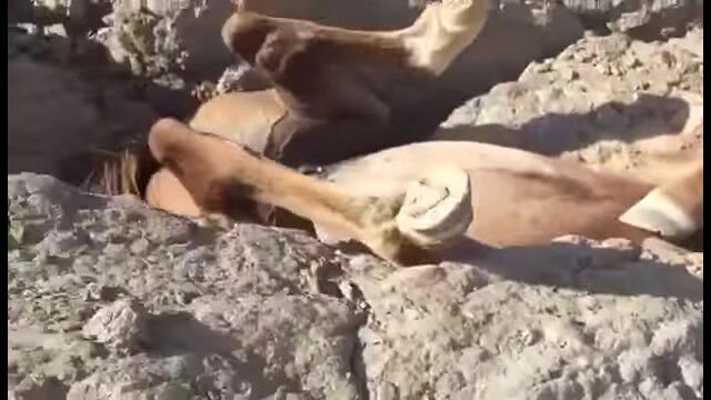 カザフスタン西部のアクタウにて、狭い岩の隙間に、上下逆さまになった状態ではまり込んでしまった馬を、通りかかった人々が発見。