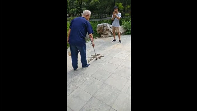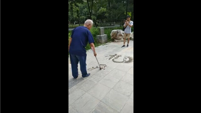 大きな筆に水をつけ、地面に漢字を書く中国のおじいちゃん。