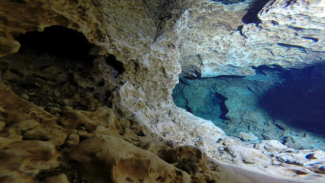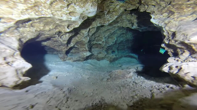 アメリカ、フロリダ州マディソン郡、マディソン・ブルー・スプリング州立公園にある水中洞窟を進むダイバー視点の映像。