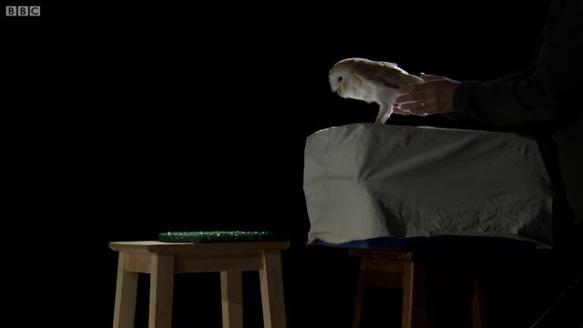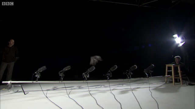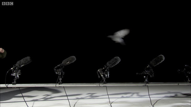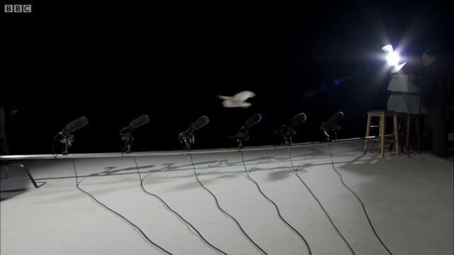 超高感度マイクを一列に並べ、その真上を通るようにハト、ハヤブサ、メンフクロウを飛ばす実験映像。