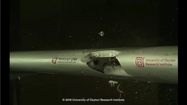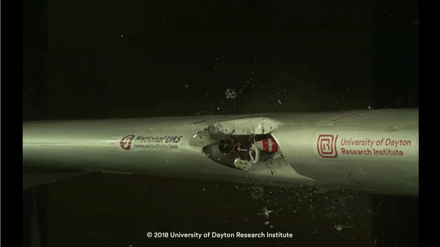 実験では、小型飛行機「ムーニーM20」の主翼と、ドローン「DJI ファントム2」が、時速383キロで衝突した場合を再現。