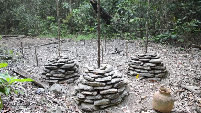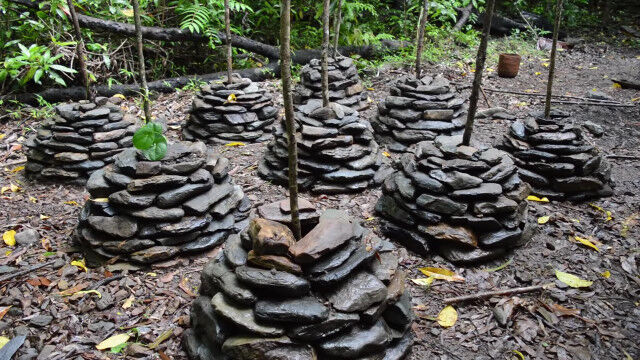 石を積んでプランターとすることで、ヤムイモを狙うイノシシはそこにヤムイモがあることに気付けず、石をひっくり返す力のないヤブツカツクリからも守れる。