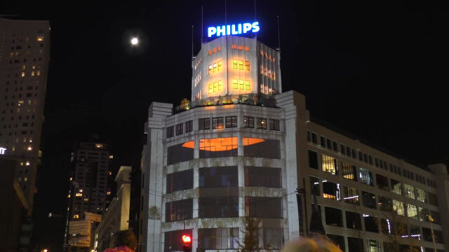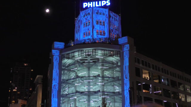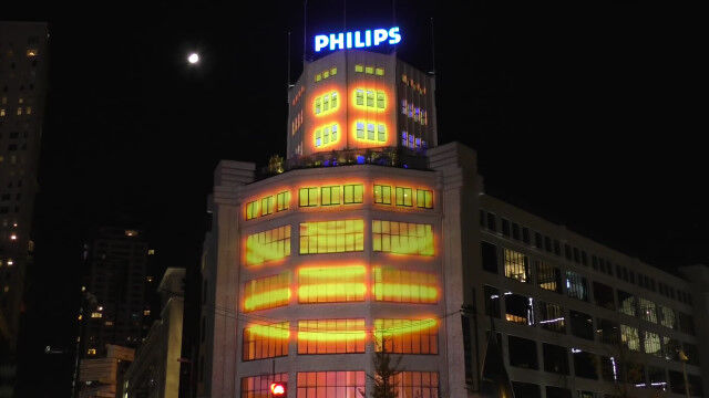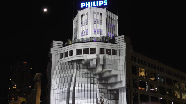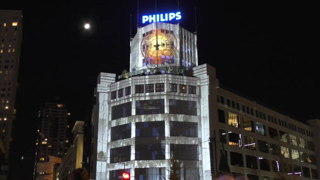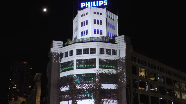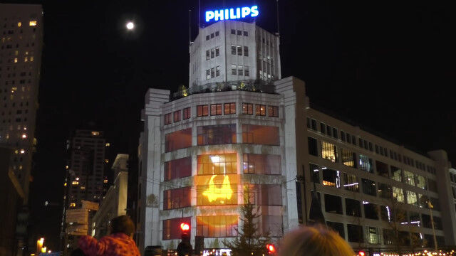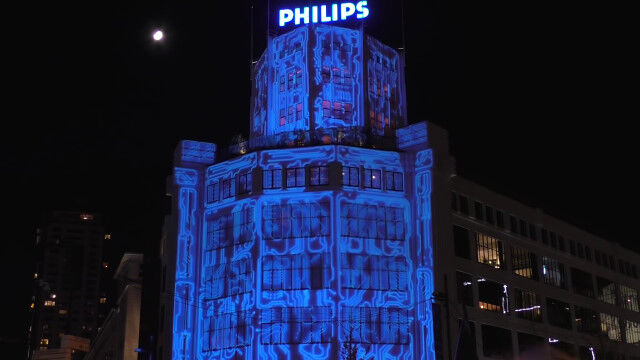 オランダ、アイントホーフェンのPhilips Lichttorenビル外壁で行われたプロジェクションマッピング。