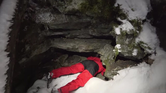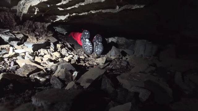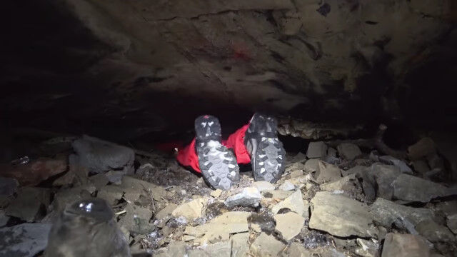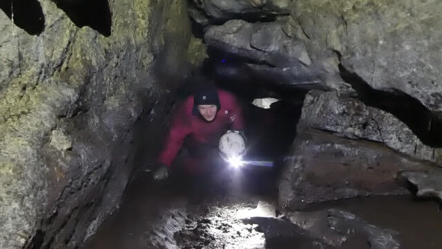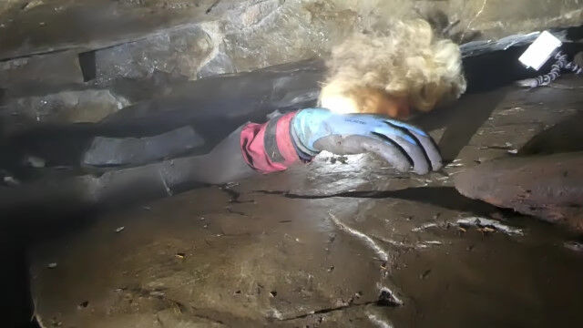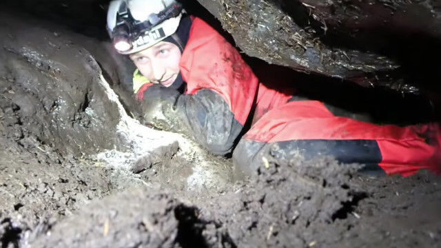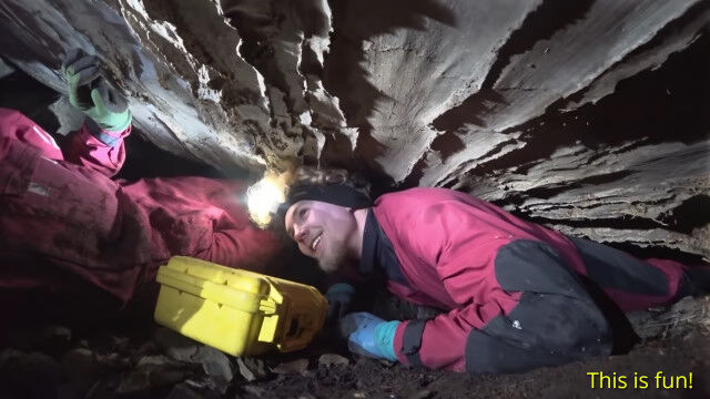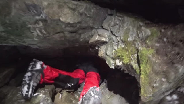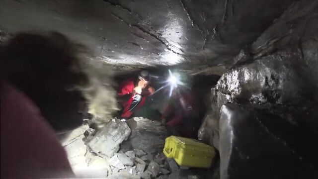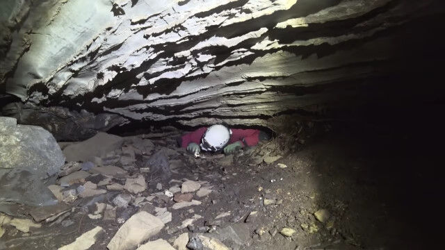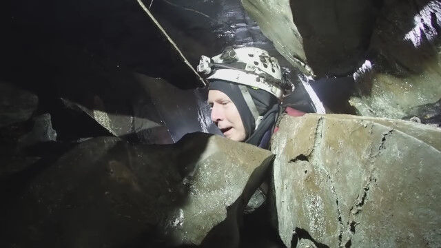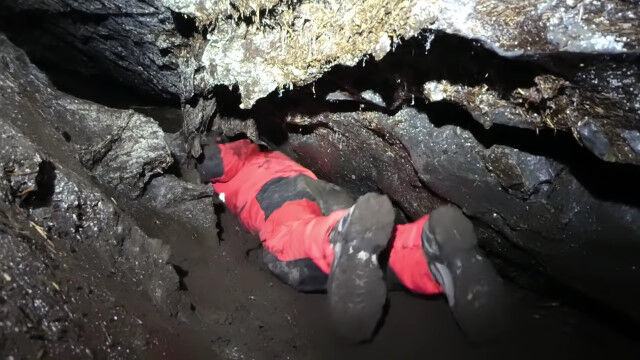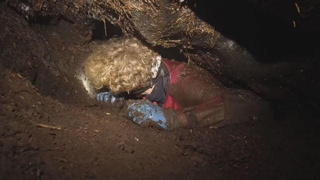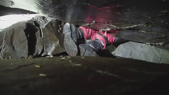 閉所恐怖症の人はもちろん、そうでない人でもこんなところ入りたくないと思わせる、狭すぎる洞窟を進む男たち。
