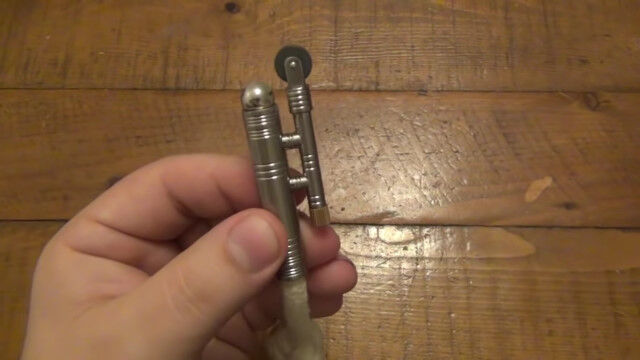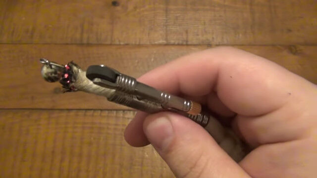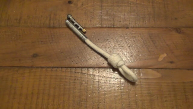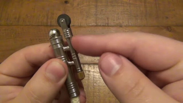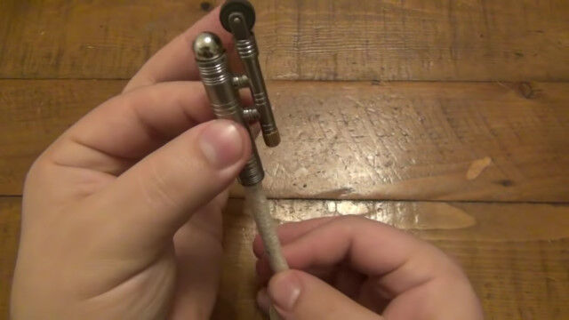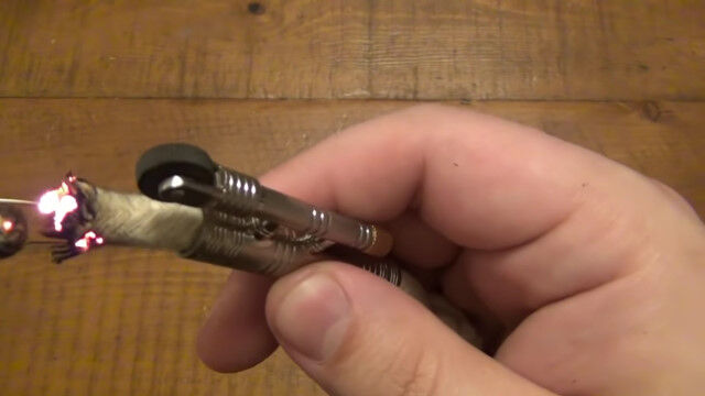 ローラー上のヤスリでフリントから火花を飛ばし、ロープに直接点火する、シンプルな「ロープライター」。