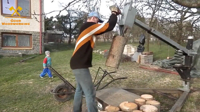 バネの力で上下する、シーソーのような自作の薪割り機。
