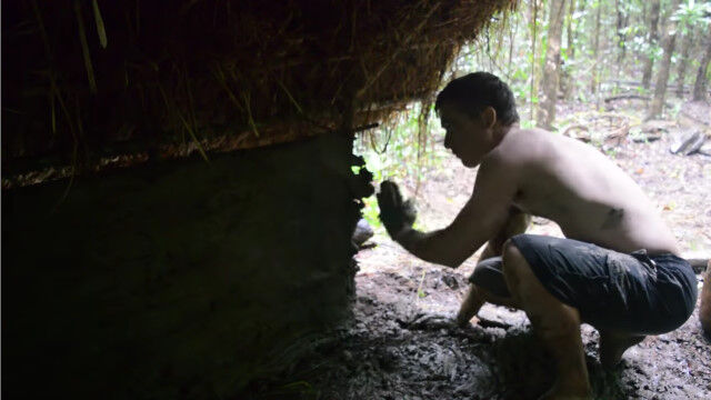 趣味として原始生活を営み、工具や土器、窯に瓦屋根の家まで作り上げてしまうお兄さんが、雨季に入ったオーストラリアで、雨の日でも乾燥した作業エリアを用意するための小屋作り。