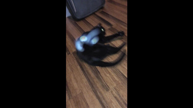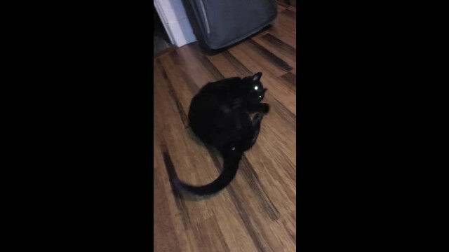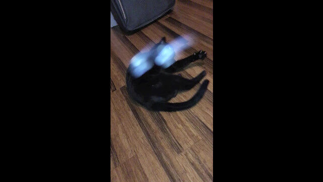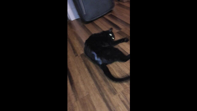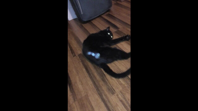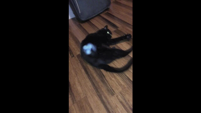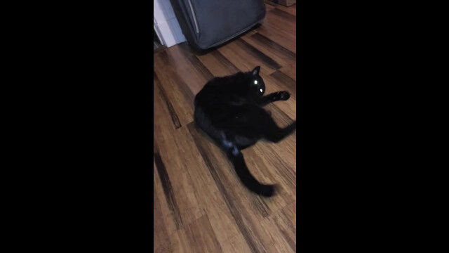 フローリングに横たわる黒猫を、飼い主がワシャワシャと可愛がる。