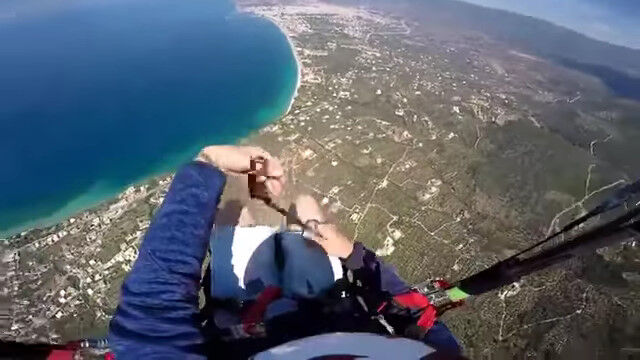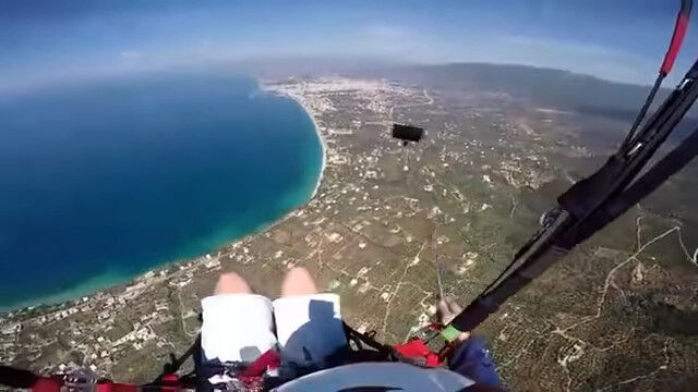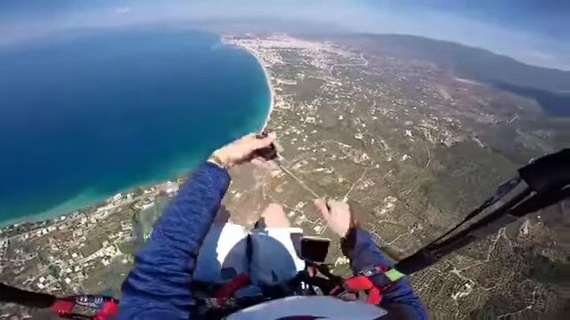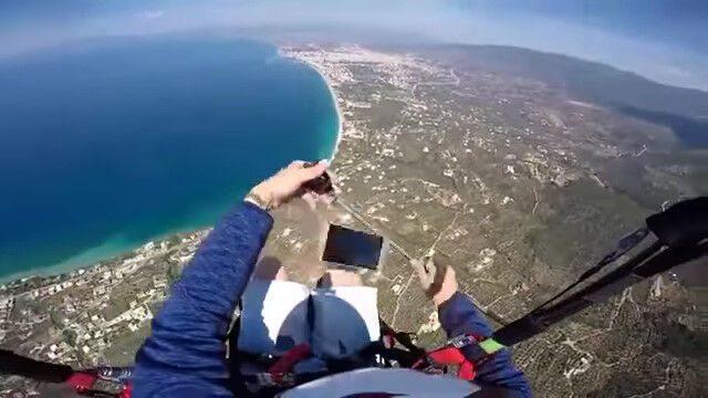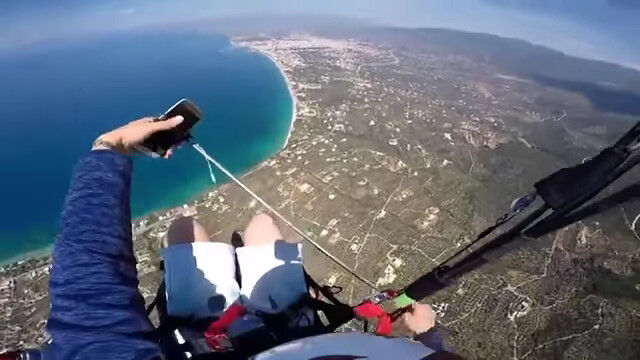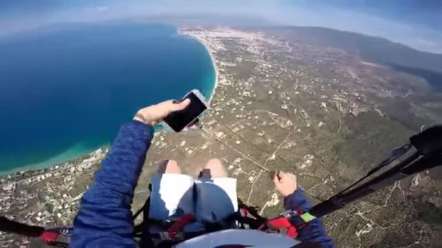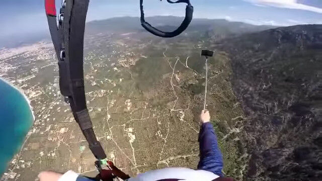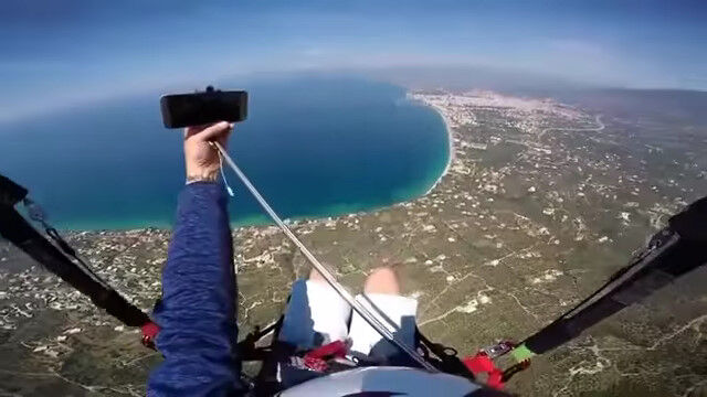 パラグライダーで空の旅を楽しんでいるところを、自撮り棒で自撮りする撮影者。
