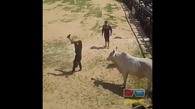 逆立ち男ににじり寄られた牛は挑発に乗って男に突進。