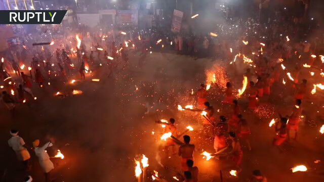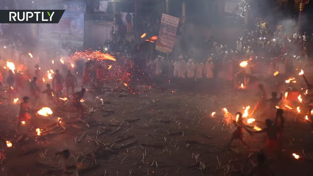 女神ドゥルガーを鎮めるために行われるお祭りで、上半身裸の男たちが2つの集団にわかれ、火のついたたいまつを互いにぶつけ合うという「火の戦い」が凄い。