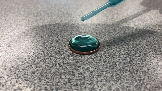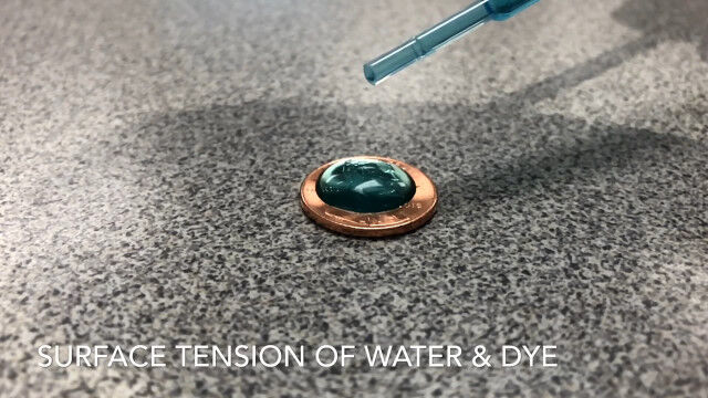 1セント硬貨の上にスポイトで1滴ずつ水を垂らしていくという実験映像。