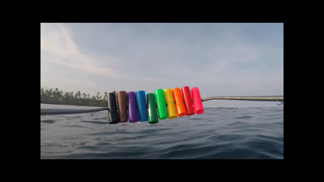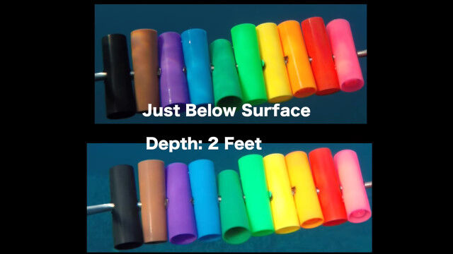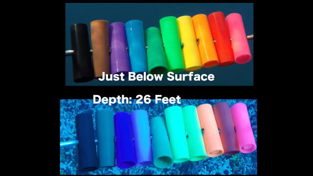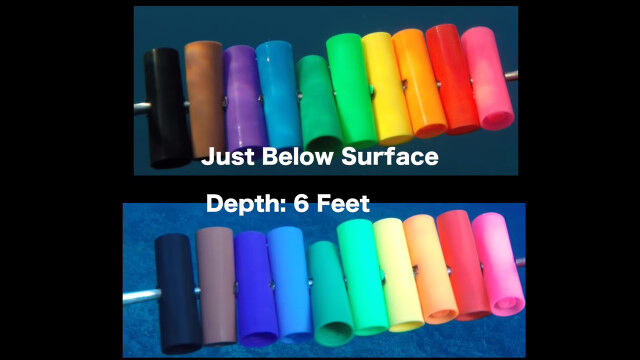 見本となるカラフルな筒を水中に沈めていき、水中で色がどんな具合に失われていくのかを撮影した映像。