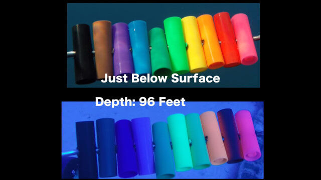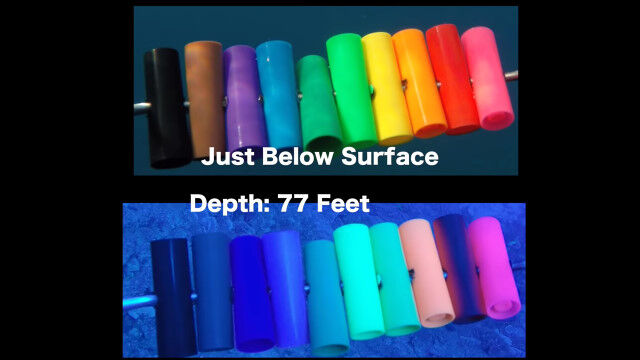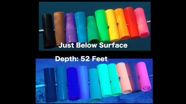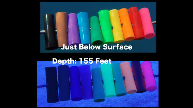水面下に入れる所から、水深155フィート(約47メートル)まで、徐々に色合いが変化していく様子を見ることができる。