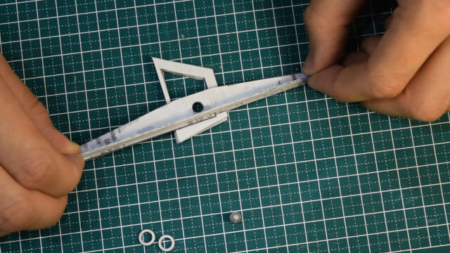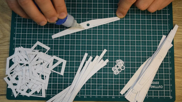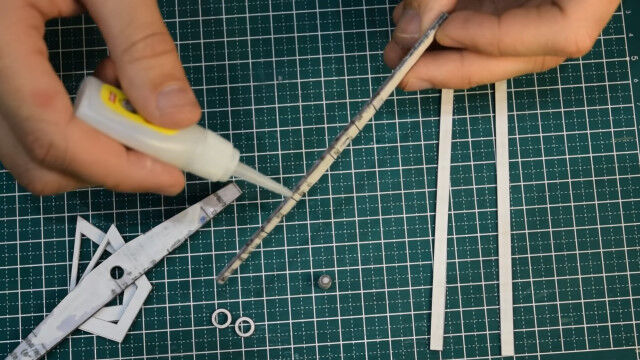 素材となる紙を瞬間接着剤で何枚も張り合わせて硬度を上げ、斜めにカットした刃の部分にも接着剤を追加するのがポイント。