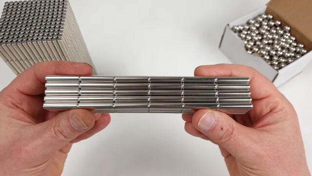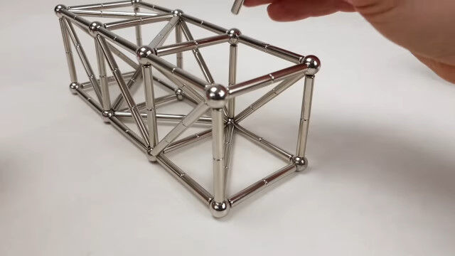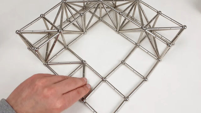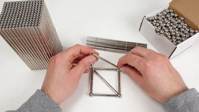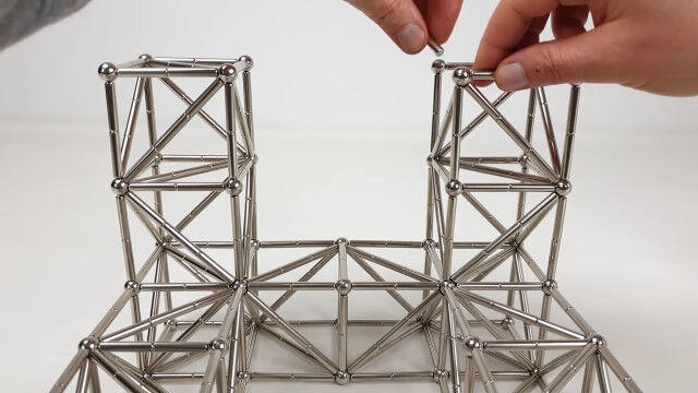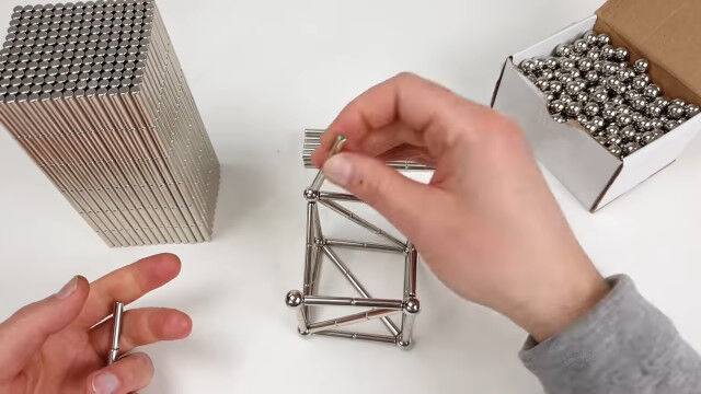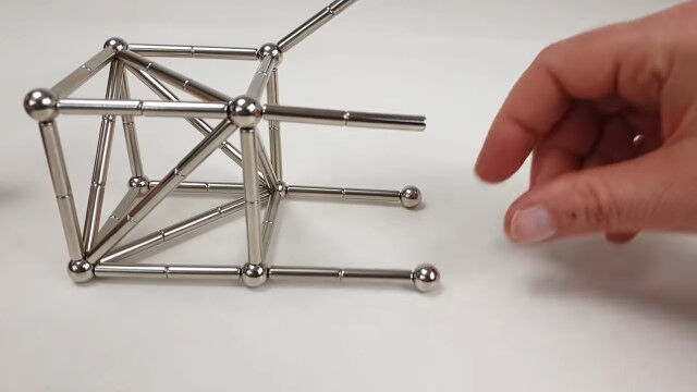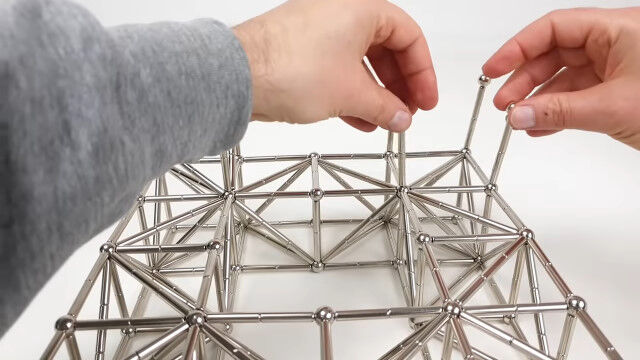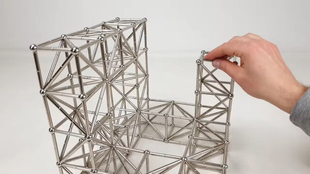 強力なネオジム磁石の棒と金属球を使い、大きな立体を組み立てていく映像。