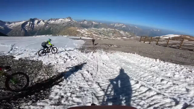 雪深く埋もれたダウンヒルコースを強引に走る、マウンテンバイクのライダー視点映像
