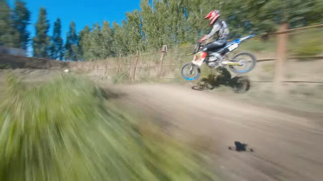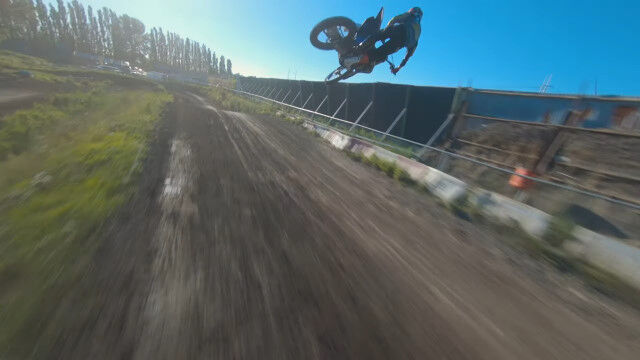 モトクロスのジャンプトリックを一緒にジャンプしながら撮影した迫力の映像