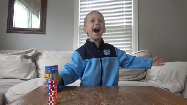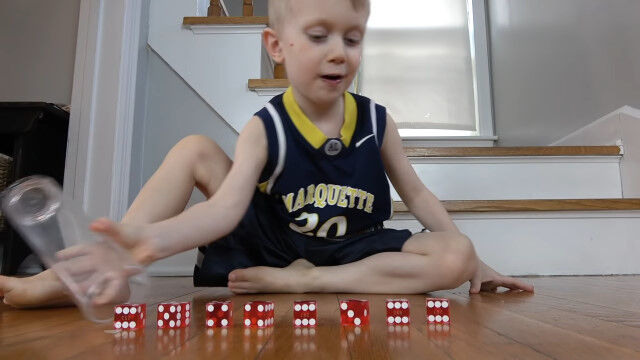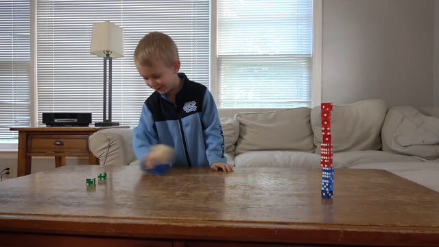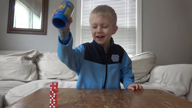 サイコロをカップですくい取り、積み上げるダイススタッキングの様々な技を披露してくれる5歳の少年、コリンくん。