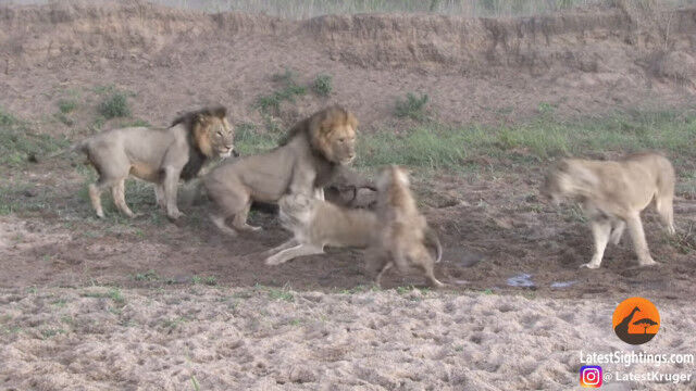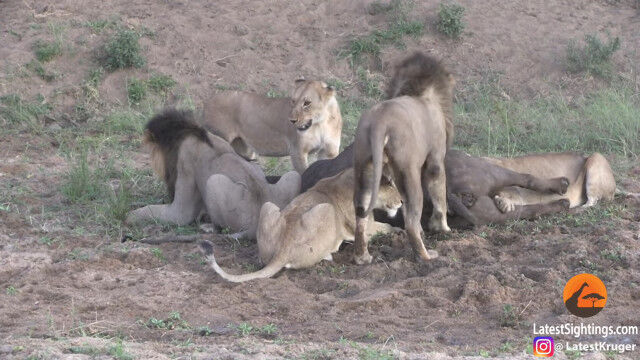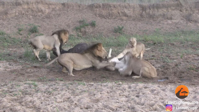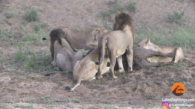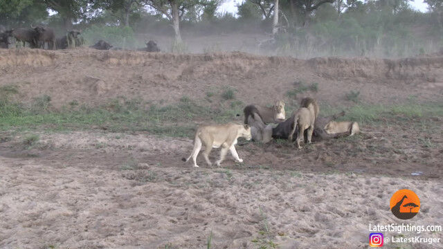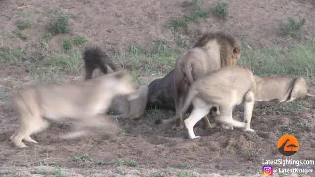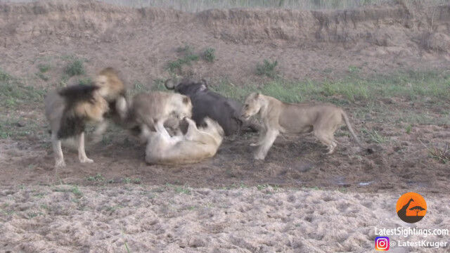 ライオンの群れに狙われ、雄ライオンを含む数頭に襲いかかられ、倒されてしまったアフリカスイギュウ。