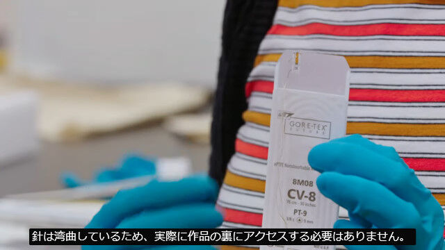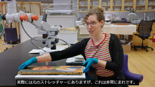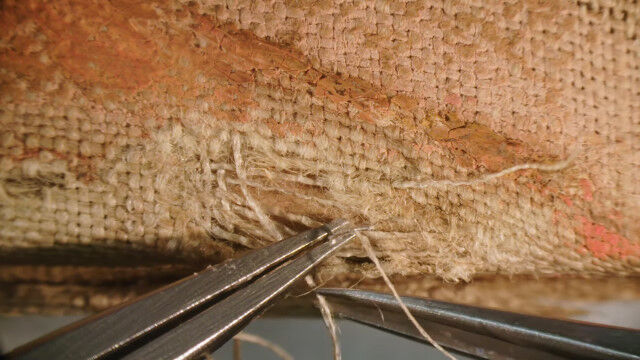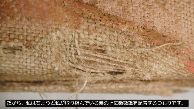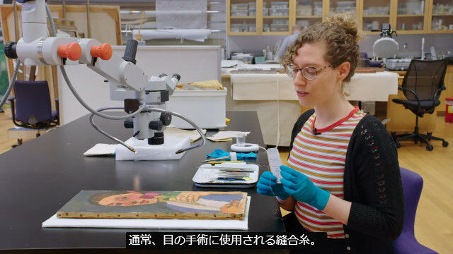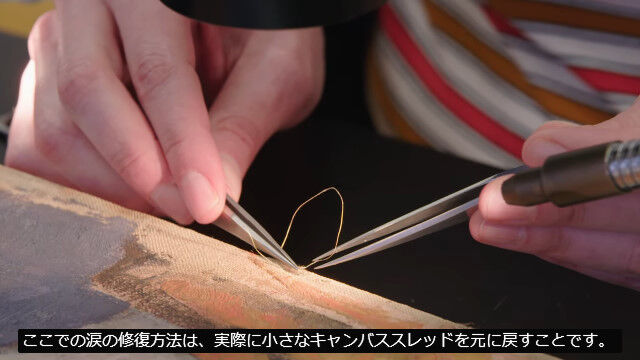 キャンバスはオリジナルのものであるためそのまま残し、目の手術で扱う針と糸を使用して、顕微鏡を覗き込みながら表面から破損箇所を縫い合わせていく。