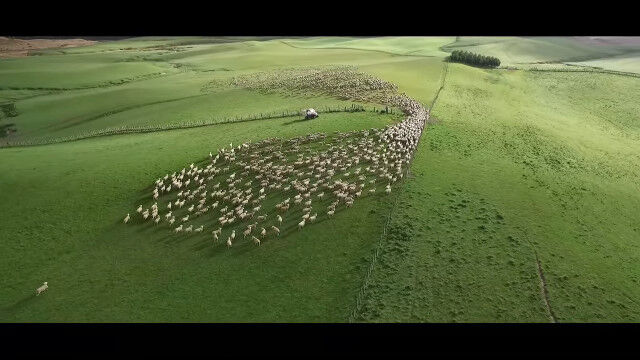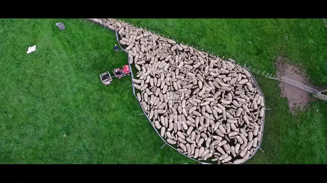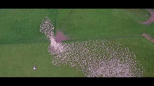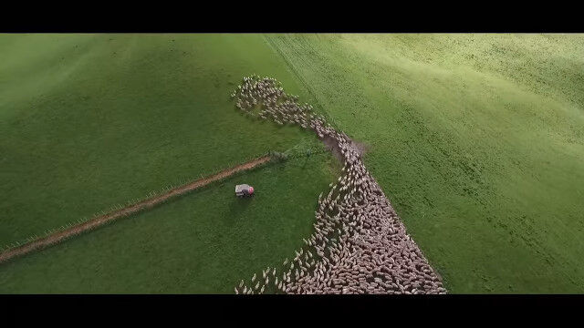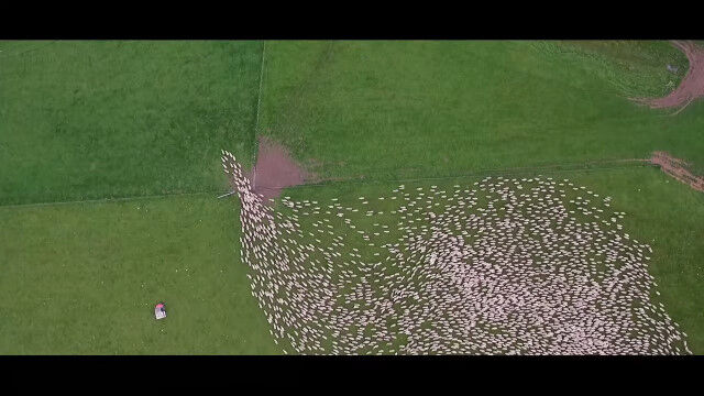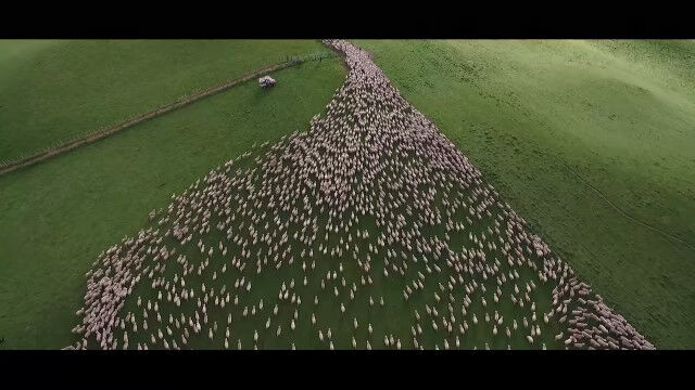 見渡すかぎりの羊の群れを、じわじわ割り進む映像