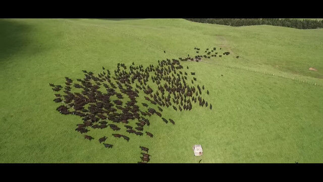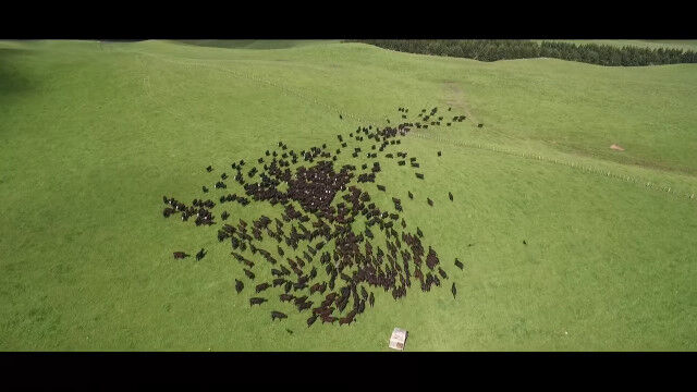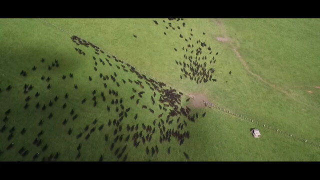 ニュージーランド、ランギティケイの牧場にて、ヒツジの群れを上空からドローンで撮影した映像。