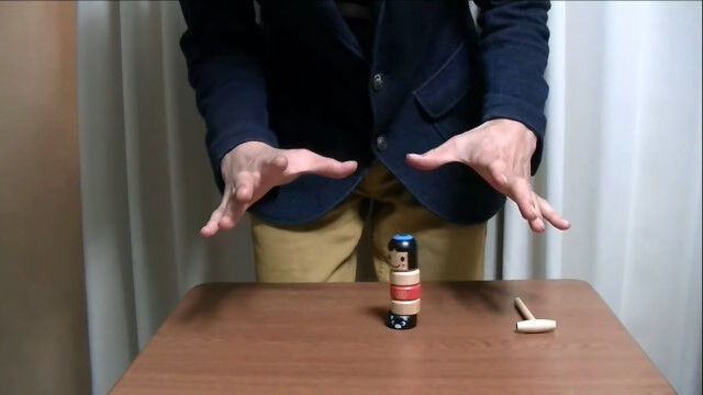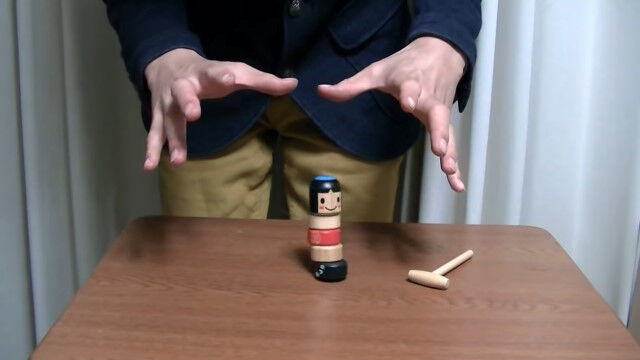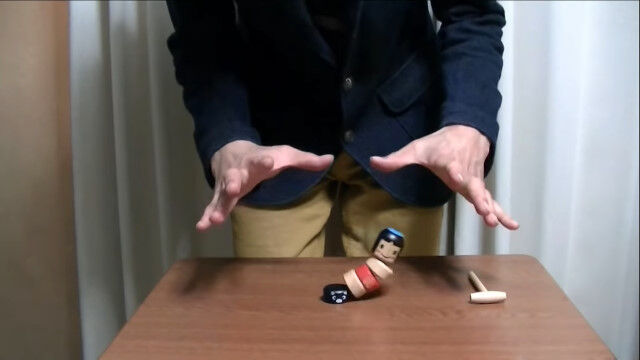 ところが、何度崩しても復活するし、ハンマーを避けたり、手のひらに飛び乗ったりする、不思議な手品道具「不死身のだるま」。