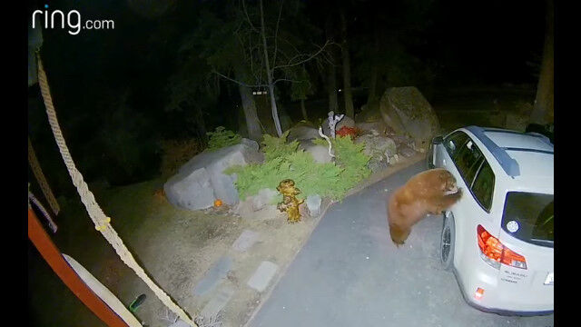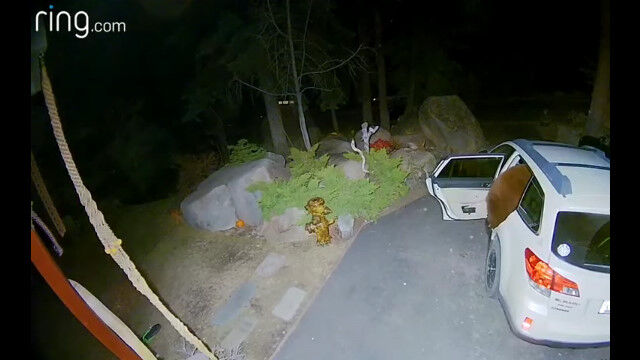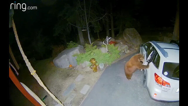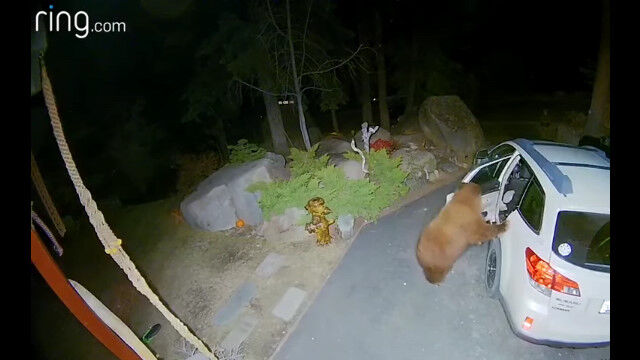 防犯カメラが撮影した、車のドアを開けて中を物色する野生のクマ。
