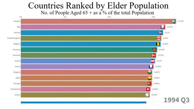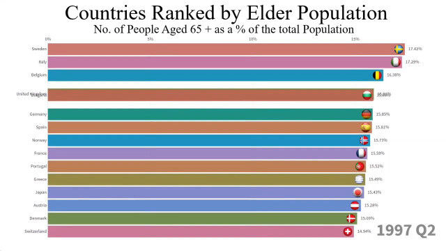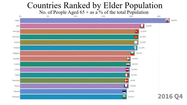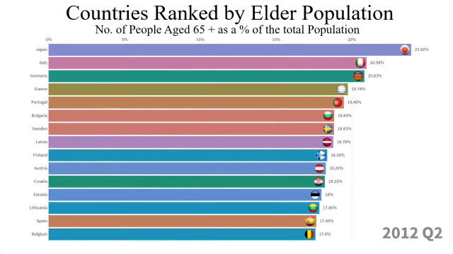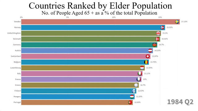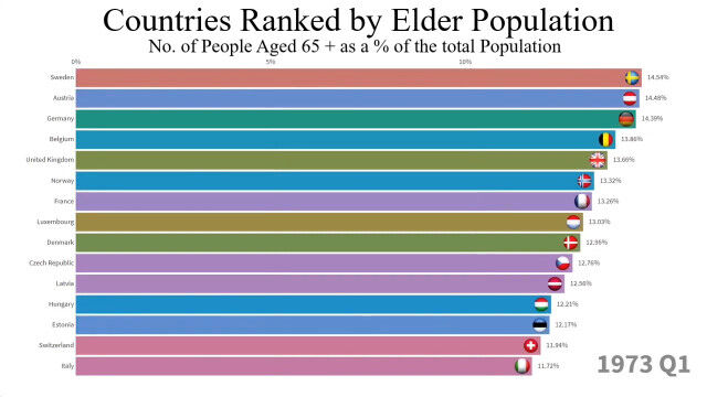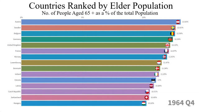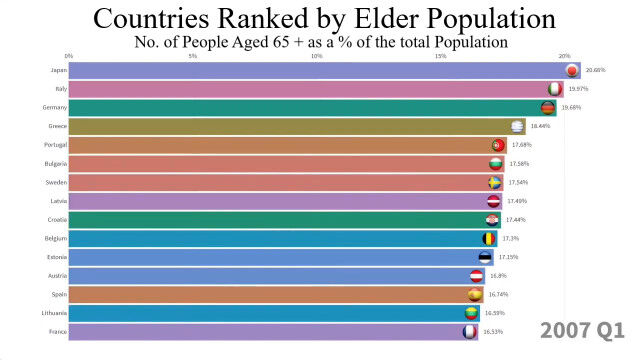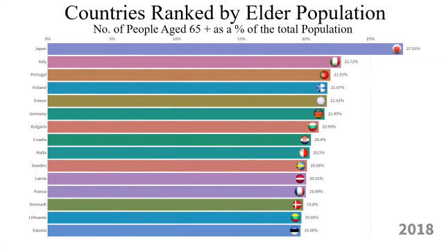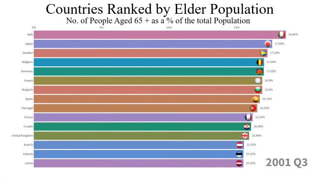 1960年から2018年まで、最も高齢者の割合が多い国トップ15の変化を視覚化した映像。