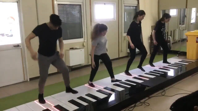 足で演奏するタイプの巨大ピアノを、4人のピアニストが一緒に演奏。