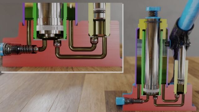 内部構造を図解しつつアニメーションさせた映像で見た、油圧ジャッキの仕組み。