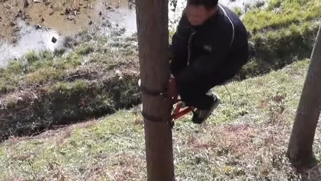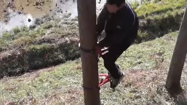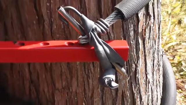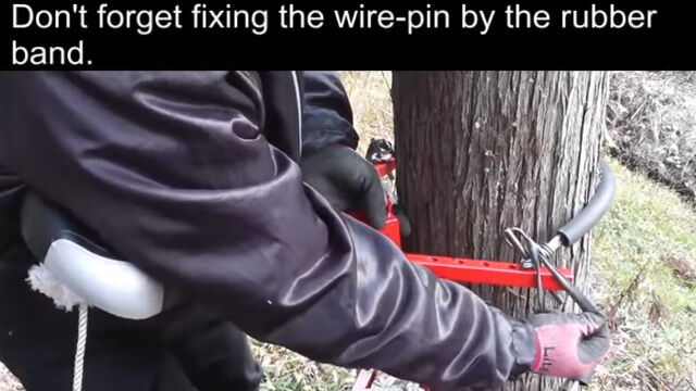木の幹の太さに合わせてサスケの長さを調整して取りつけたら、上下それぞれを交互に持ち上げたり、降ろしたりするだけ。