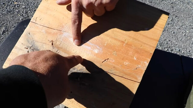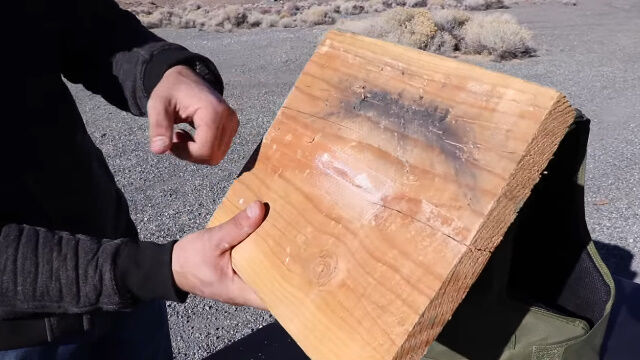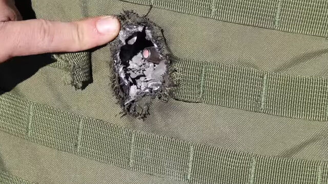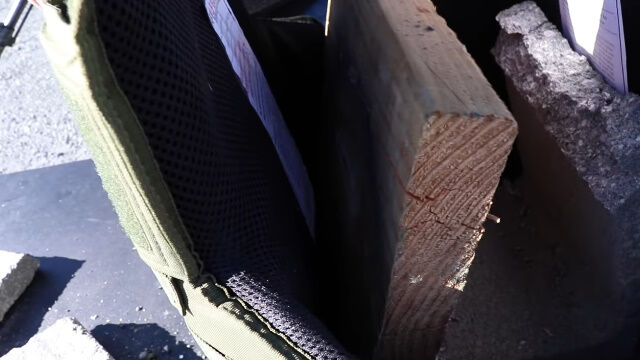 弾は貫通していないけれど、防弾チョッキ内部のコンクリートブロックは壊れているし、その手前の板も割れてるし、板の中央は凹んでさらにチョッキ内側の生地の模様がクッキリ刻み込まれているし。