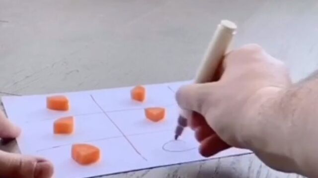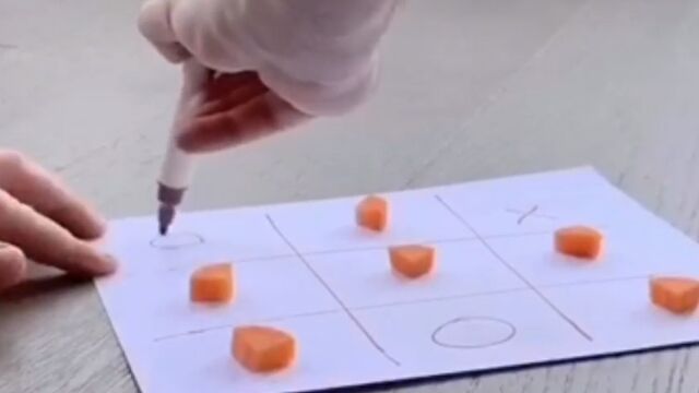 マルやバツを書く部分におやつを置き、交互に一つを選ばせて、飼い主がマルバツを記入。