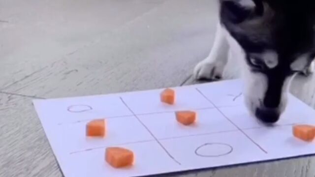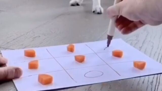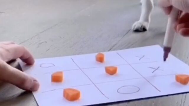 三目並べ、いわゆるまるばつゲームをペットの犬2匹にプレイさせてヒマつぶしをする飼い主。