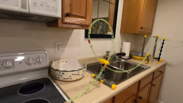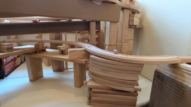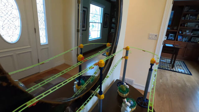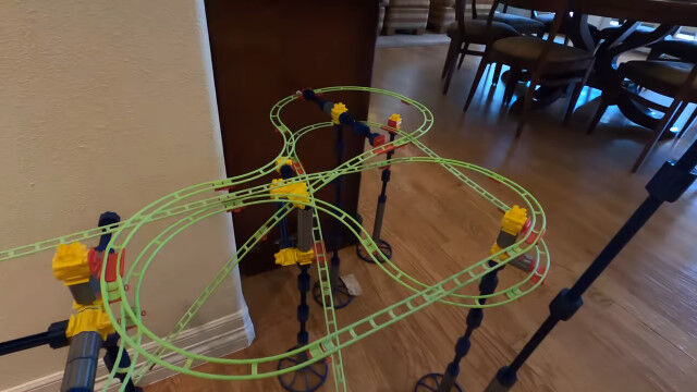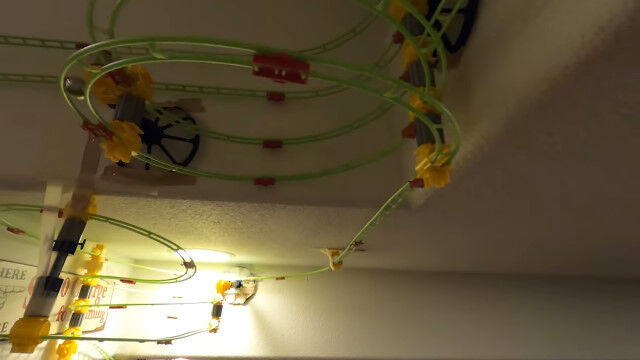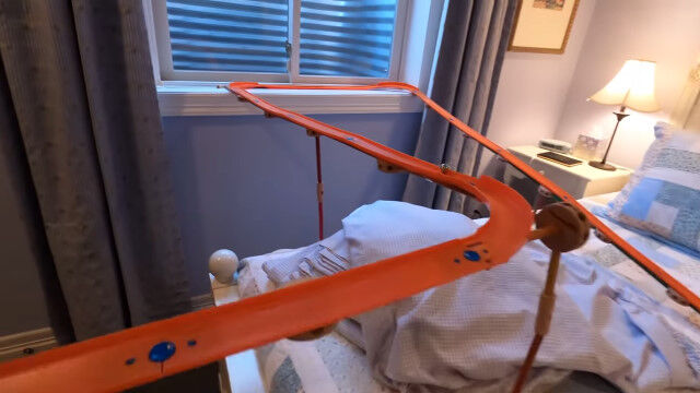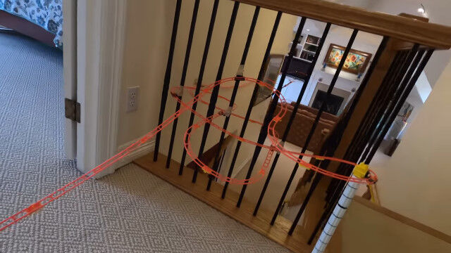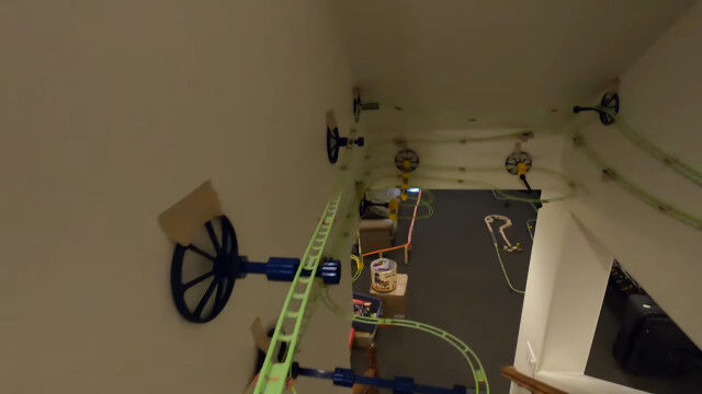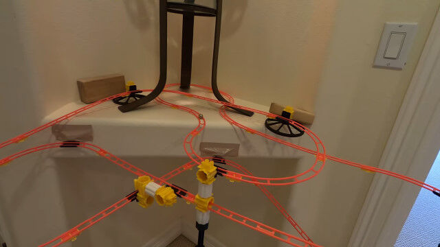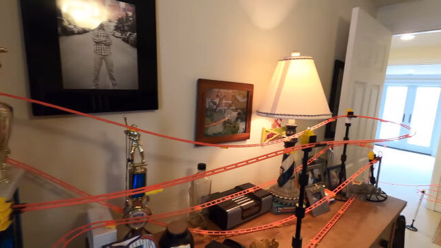 いくつかのオモチャのレールを組み合わせ、9日間かけて作り上げた、全長165メートルの屋内コース。