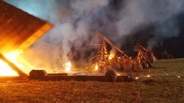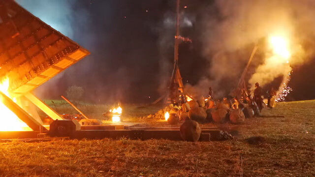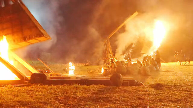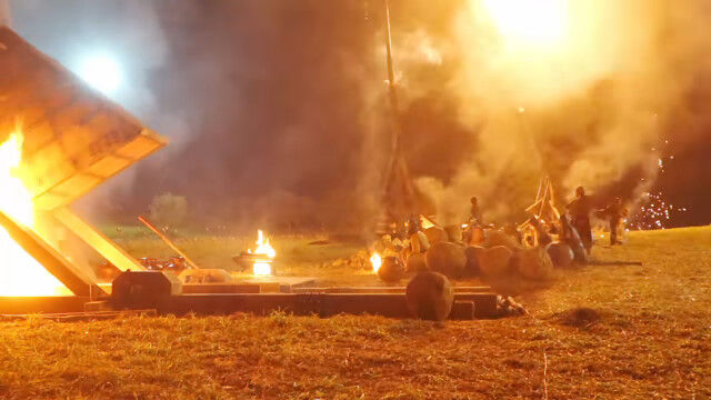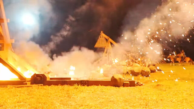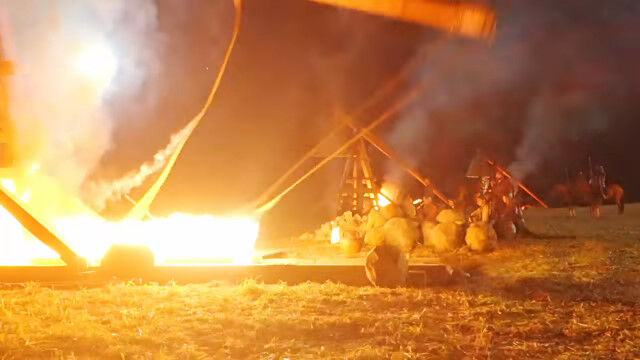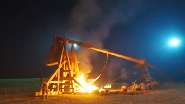 ドラマ撮影用に本物のトレビュシェットを製作。燃え盛る弾を遠く離れた砦にぶちこむ