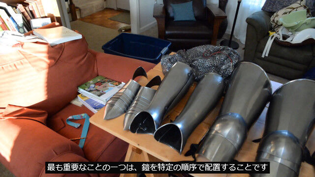 鎧の内側に着用するジャケットはあらかじめ着込み、アーマーのパーツは着やすく並べた状態で、人の手も借りつつ1:18から着用開始。