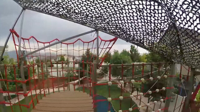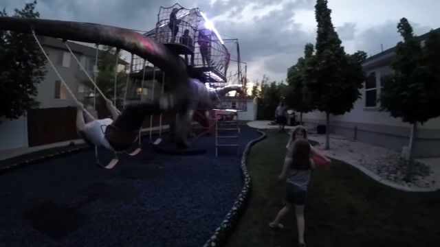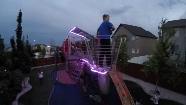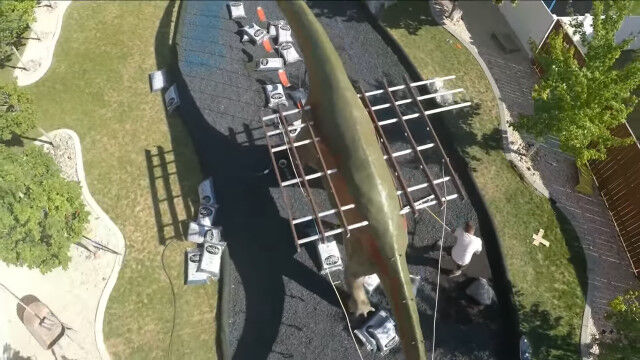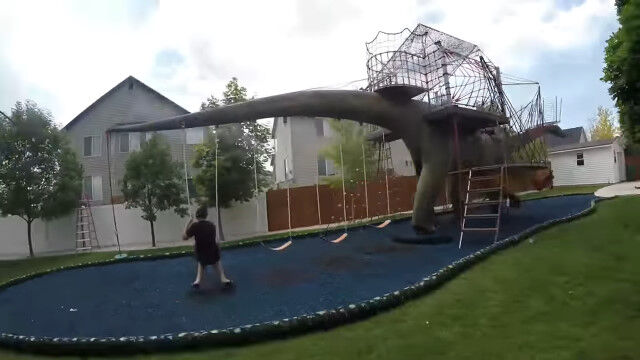 頑丈に作られた恐竜を土台に、ブランコや滑り台、各種アスレチック用具を取り付けて、とても個人の庭とは思えない状態に。