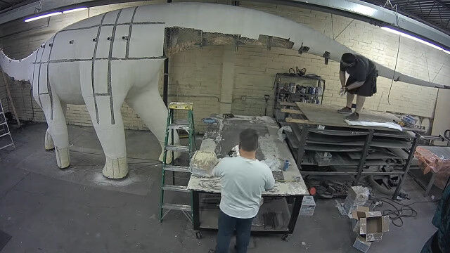 子どもたちが楽しめるよう、庭に設置したのは巨大な恐竜のオブジェ。
