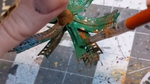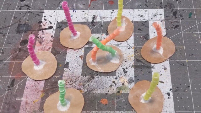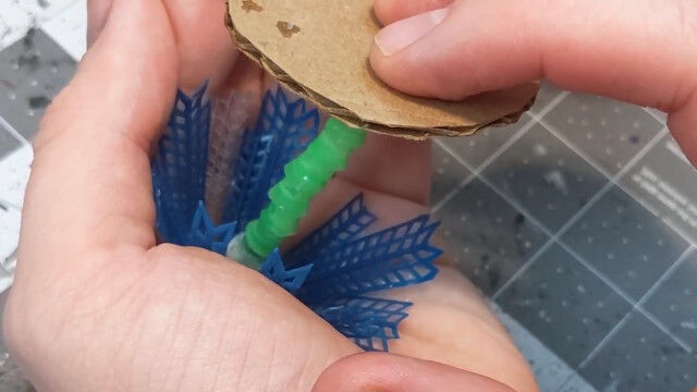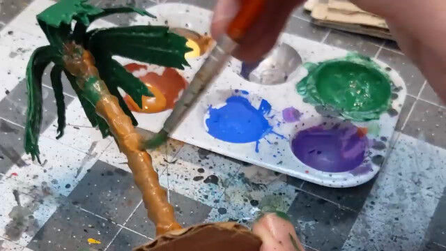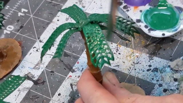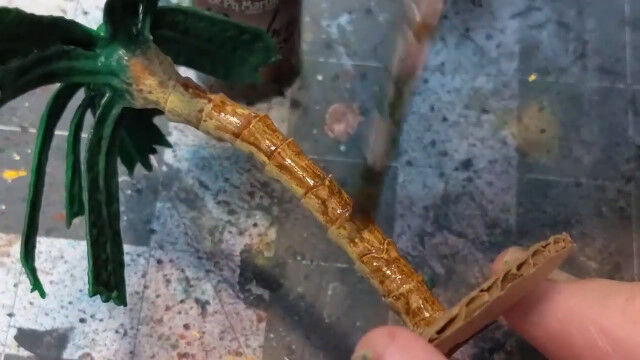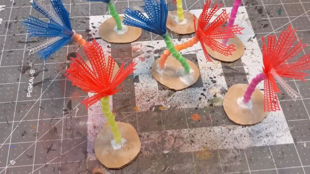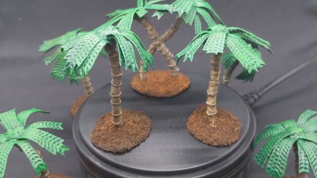 バドミントンのシャトルをバラし、ストローの口を広げて切り落としたものを組み合わせ、ヤシの木を作るというジオラマ作りのテクニック。